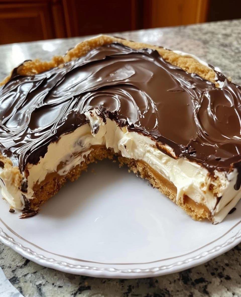 No-bake desserts are magical because they give you all the satisfaction of a classic homemade treat without the stress of baking. This pie is the perfect example: creamy, crunchy, sweet, and silky all at once. The base layer is typically a graham cracker or biscuit crust, pressed firmly to create a solid foundation. Next comes a generous layer of caramel—smooth, buttery, and melt-in-your-mouth. On top of the caramel sits a luscious cream cheese or vanilla cream filling that brings balance and lightness. The final touch is a thick layer of melted chocolate spread across the top, giving the pie its luxurious, shiny finish.