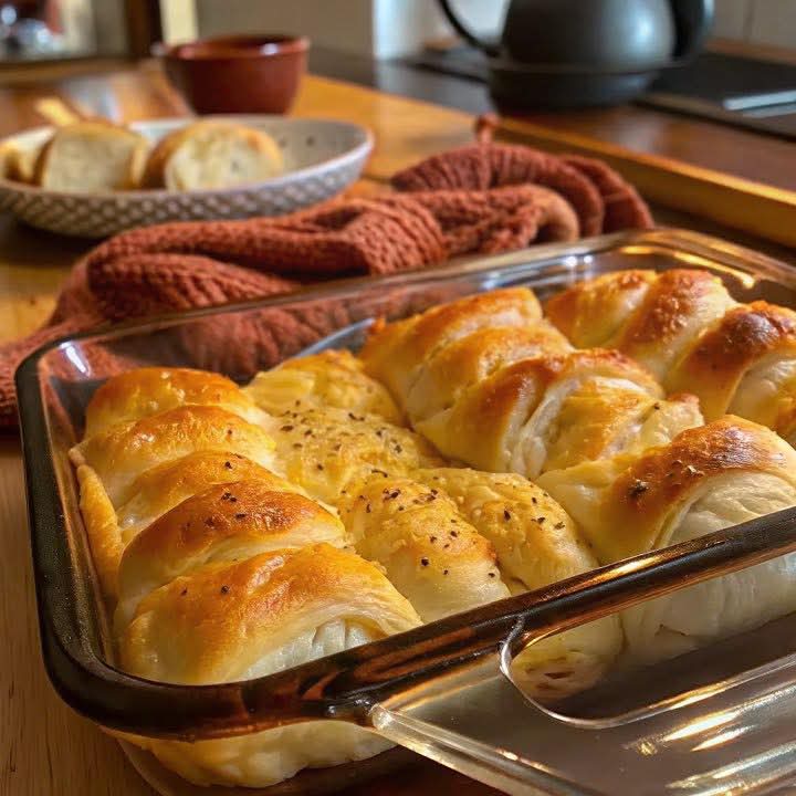 These soft cheese rolls are a comforting homemade bread that combines the fluffiness of a classic dinner roll with the savory richness of melted cheese. The rolls in your photo are golden brown on top, layered, slightly shiny from an egg wash, and perfectly baked in a rectangular glass baking dish. They have a tender pull-apart texture, making them ideal for sharing with family or guests.
