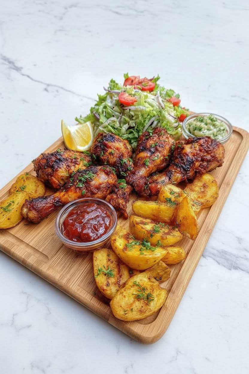 Sizzling Grilled Chicken Drumsticks with Crispy Potato Wedges and Fresh Garden Salad