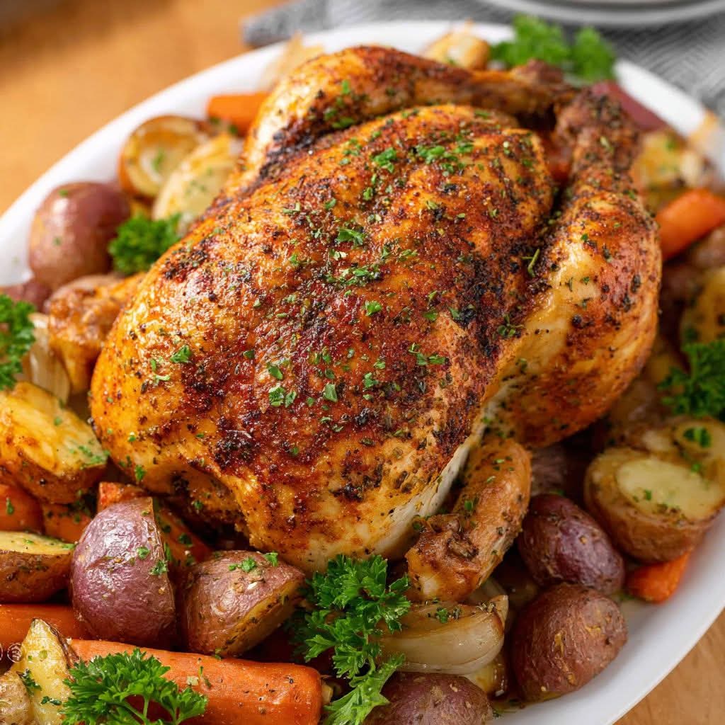 Arrange the potatoes and carrots in a roasting pan or cast-iron skillet, seasoning them with salt and oil. Place the chicken on a rack over the vegetables to allow air to circulate, which ensures the skin on the bottom doesn’t become soggy. Roast for approximately 1 hour to 1 hour 20 minutes, or until a thermometer in the thickest part of the thigh reads 165°F (74°C).