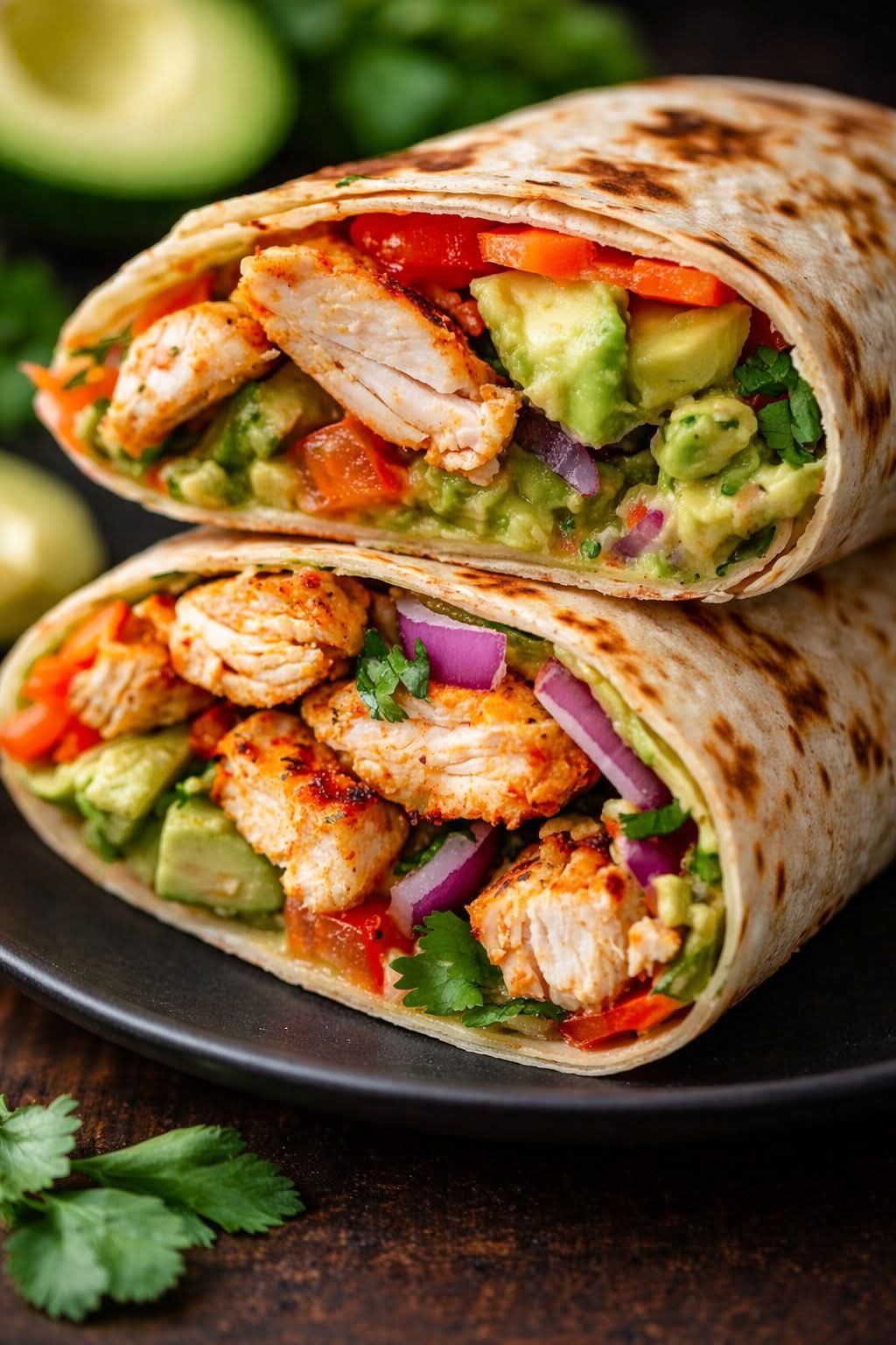 The Grilled Chicken Avocado Wrap, as masterfully captured in your culinary collection, represents the pinnacle of handheld gourmet dining. This dish is far more than a simple sandwich; it is a meticulously constructed balance of warm, smoky proteins, cool, velvety fats, and the sharp, acidic bite of fresh garden vegetables. Characterized by its toasted, golden-brown exterior and a densely packed, colorful cross-section, this wrap exemplifies the “big flavor” philosophy that defines high-quality, nutrient-dense cooking.
