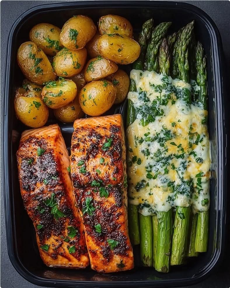 The Grilled Salmon with Asparagus and Baby Potatoes, as masterfully presented in your culinary collection, represents the gold standard of modern nutrition and gourmet plating. This dish is a celebration of the “Big Flavor” philosophy, where high-quality lean proteins, complex carbohydrates, and fibrous greens are brought together through precision cooking and vibrant garnishing. Characterized by the deep, mahogany sear of the salmon fillets, the golden sheen of herbed baby potatoes, and the tender-crisp texture of cheesy asparagus, this platter is designed for those who refuse to compromise between health and indulgence.