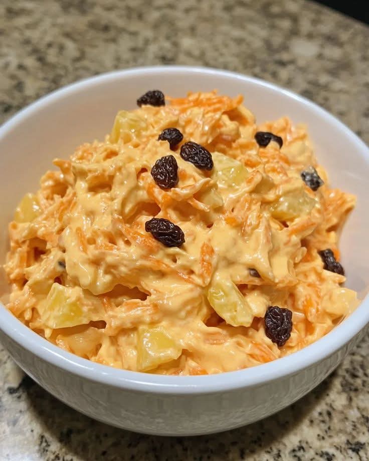 The Creamy Carrot Pineapple Salad, as showcased in your culinary collection, is a vibrant and nostalgic dish that perfectly balances sweet, tangy, and creamy elements. This salad is a hallmark of “bright flavor” cooking, where the natural sugars of shredded carrots and juicy pineapple chunks are brought together by a silky, velvet-like dressing. Garnished with dark raisins for a chewy contrast, this dish is as visually appealing as it is refreshing.