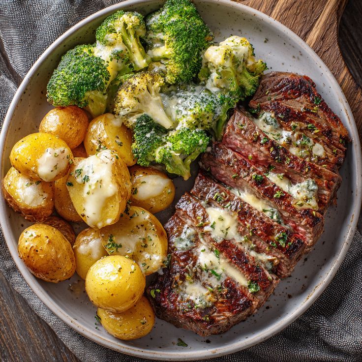 The Garlic Butter Steak with Roasted Potatoes and Cheesy Broccoli Bake, as masterfully captured in your culinary collection, represents the pinnacle of the “modern steakhouse” aesthetic. This dish is a celebration of the “Big Flavor” philosophy, where high-heat searing, emulsified fats, and vibrant vegetable textures converge to create a meal that is as visually arresting as it is nutritionally robust. Characterized by the deep, mahogany-crusted beef, the glistening golden sheen of the potatoes, and the emerald-green broccoli blanketed in a molten cheese glaze, this platter is designed for the ultimate indulgent yet balanced dining experience.