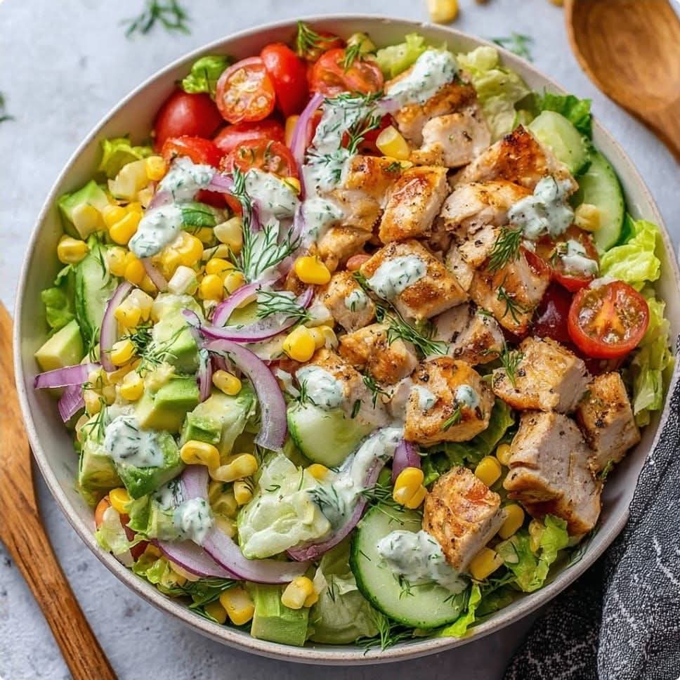 The Grilled Chicken Avocado Salad with Creamy Dill Dressing, as showcased in your culinary gallery, represents the pinnacle of modern “big flavor” healthy eating. This dish is a masterclass in the Power Bowl philosophy—a meal delivery system designed to provide a perfect ratio of lean proteins, complex carbohydrates, healthy fats, and high-fiber micronutrients in a single, visually stunning vessel. By combining high-heat grilled chicken with the cool, velvety indulgence of ripe avocado and a signature herbaceous dressing, you create a platter that satisfies the gourmet palate while fueling the body for peak performance.
