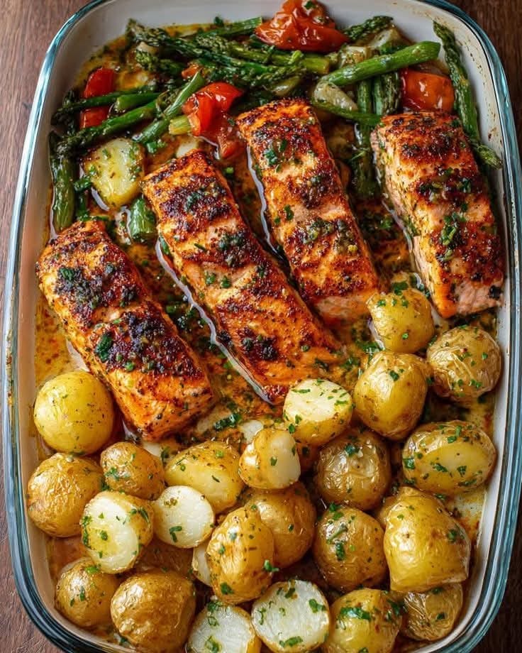 ​In the culinary world, “one-pan” or “sheet-pan” meals are celebrated for their ability to allow flavors to meld together. As the salmon roasts, its savory juices and the garlic-herb butter melt down into the potatoes and vegetables, creating a cohesive flavor profile that is impossible to achieve when cooking components separately. The image highlights the beautiful textures you can achieve: the salmon has a dark, caramelized herb crust; the baby potatoes are tender with glistening skins; and the asparagus retains a slight charred snap.