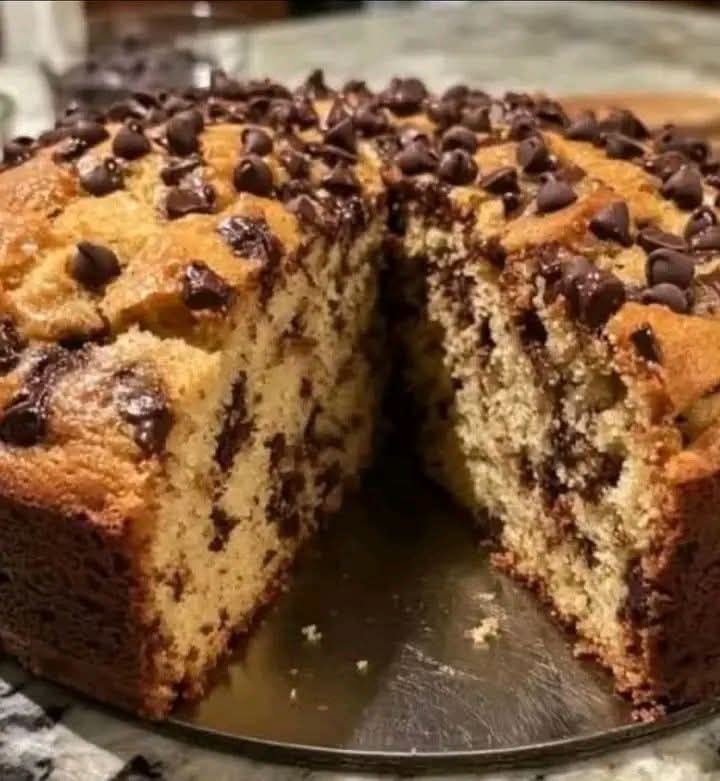• The Top Surface: The crown of the cake features a beautifully uneven, golden-brown crust. It is densely populated with semi-sweet chocolate chips that have maintained their distinct “kiss” shape, indicating they were added toward the end of the prep or sprinkled generously on top before entering the oven.