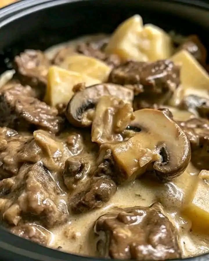 The featured image showcases a deep, dark slow-cooker basin filled with rustic chunks of beef, thick slices of earthy mushrooms, and tender potato wedges, all smothered in a shimmering, cream-based sauce.