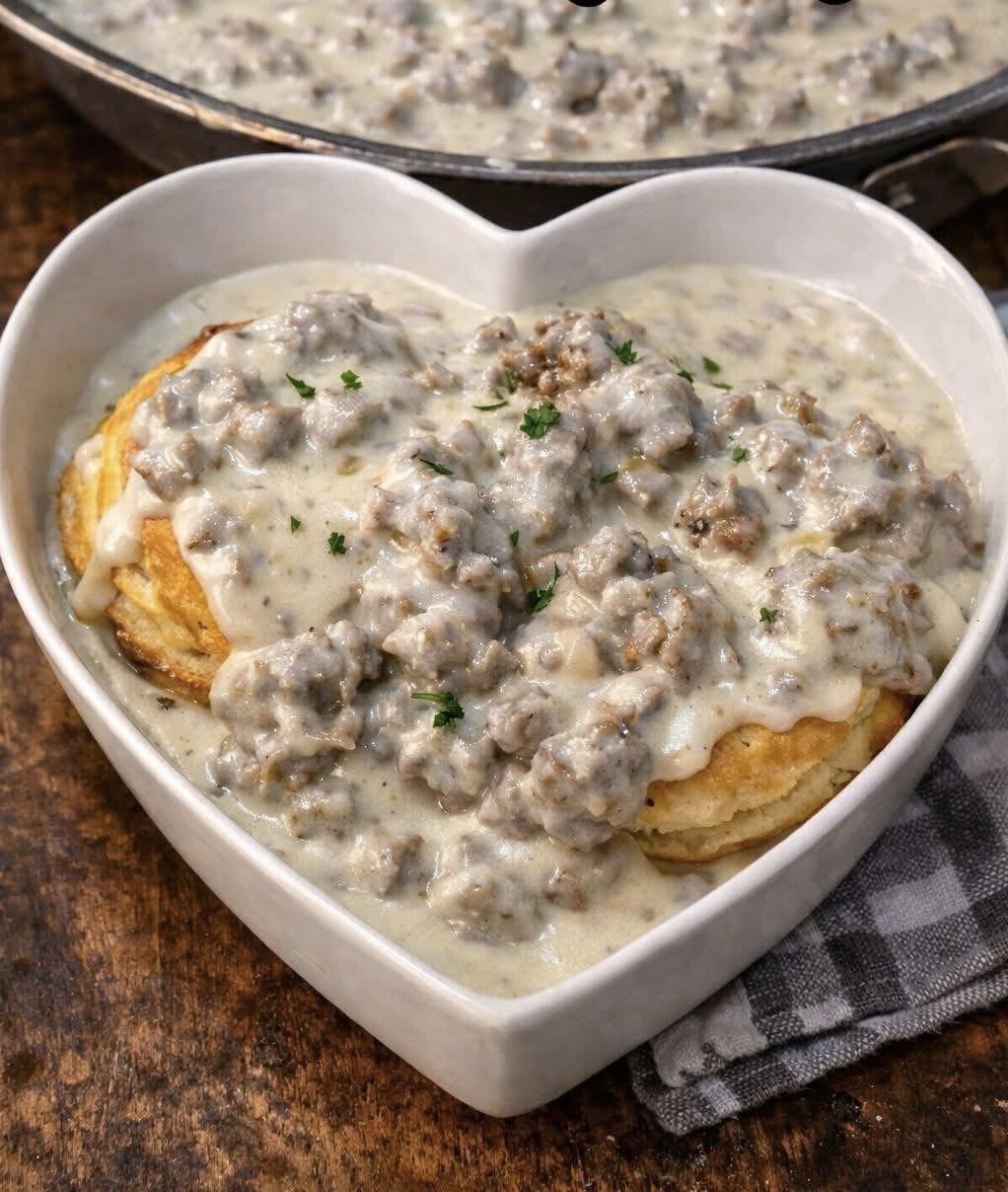 Classic biscuits and sausage gravy is the definition of comfort food — warm, creamy, and hearty. The fluffy biscuits soak up the rich sausage gravy perfectly, creating a meal that feels cozy and satisfying every time.