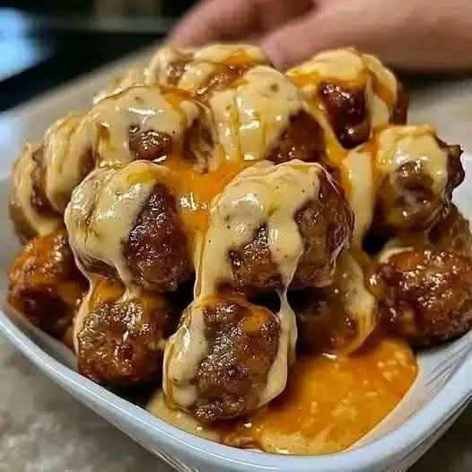 The featured image showcases a mountain of golden-brown, seared sausage spheres piled high in a white serving dish, generously draped in a thick, velvety cream sauce that exhibits a vibrant orange hue.