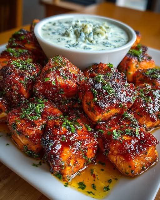 In the sophisticated world of modern gastronomy—a world that balances the rustic, slow-cooked depth of Creamy Crockpot Beef Tips with the ultra-fresh, vibrant assembly of a Seared Shrimp and Avocado Bowl—the Spicy BBQ Salmon Bites with Creamy Blue Cheese Dip stand out as a pinnacle of flavor engineering. This dish is a celebration of “Fire and Ice” culinary philosophy, pitting the aggressive heat and sticky sweetness of glazed fish against the cool, funky, and velvety profile of a classic blue cheese emulsion.