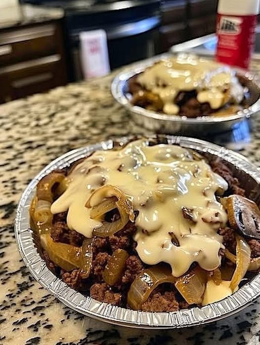 What you’re looking at is a rich, savory beef and onion dish covered in creamy melted cheese sauce—simple, heavy, and incredibly satisfying. It’s similar to a Philly cheesesteak bowl (without bread) or a loaded beef skillet.