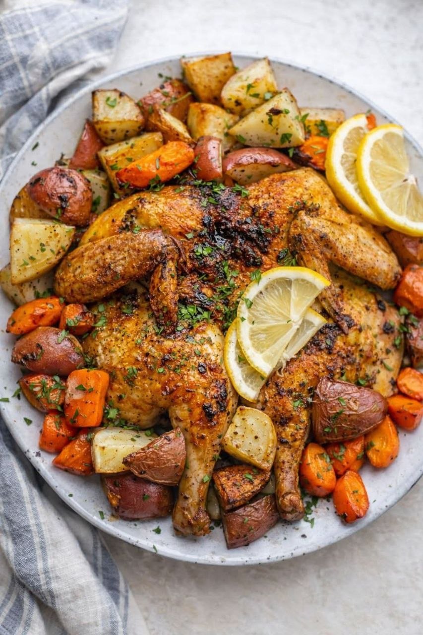 The featured image captures a platter of “Spatchcocked” chicken, surrounded by a vibrant mosaic of red-skinned potatoes and honey-gold carrots, garnished with fresh herbs and lemon wheels. This isn’t just a meal; it’s a sensory experience of textures and aromas that define the concept of “home.”