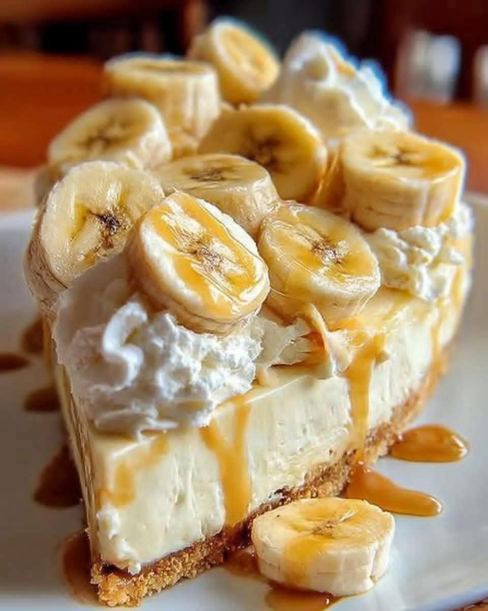 The featured image showcases a slice that is a study in textural contrast: a crisp, buttery graham cracker base, a dense and velvety cheesecake body, a cloud-like topping of whipped cream, and a crown of fresh banana slices drizzled with golden caramel.