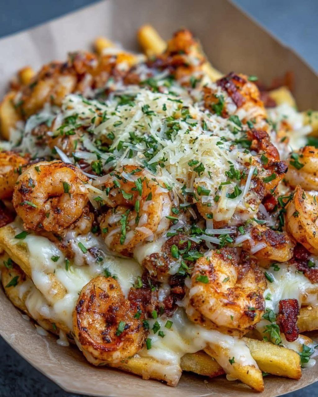 The garlic butter shrimp elevate the loaded fries from a simple snack to a gourmet-style meal.