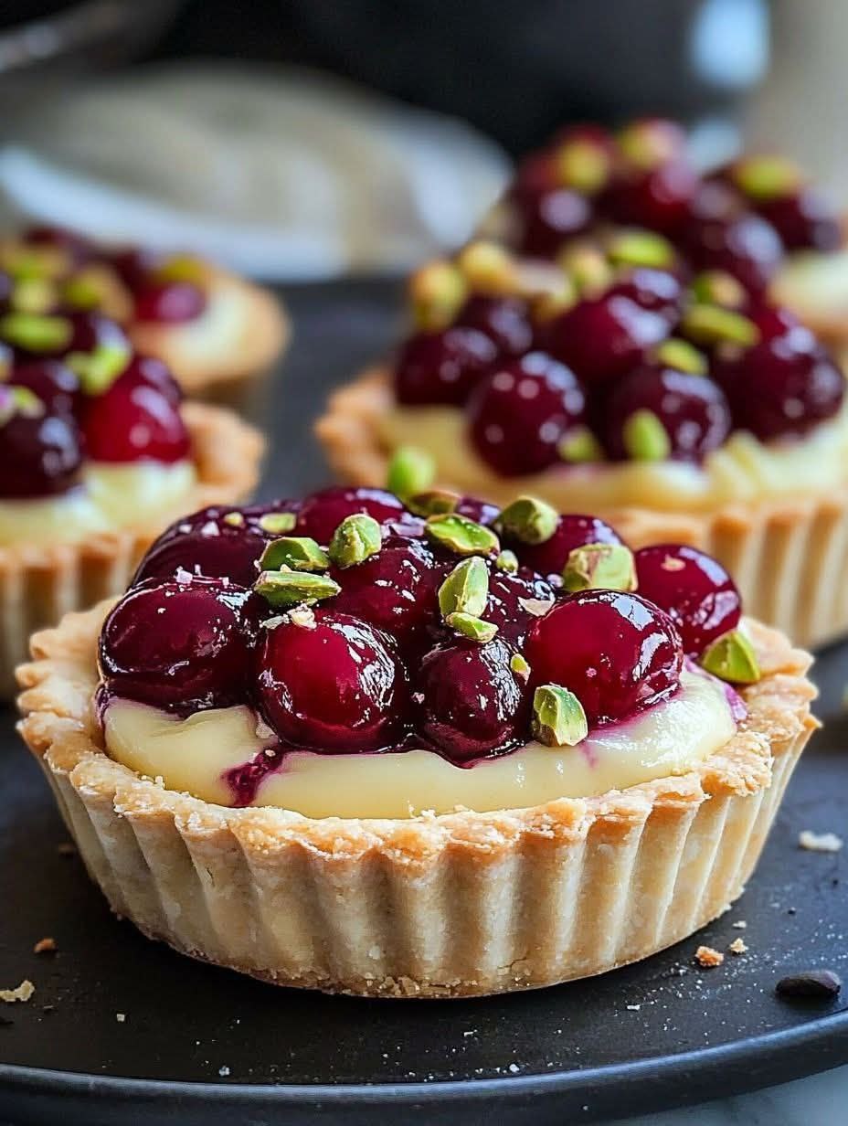 Step 4: Assemble the Tartlets Spoon cherry glaze over pistachio cream. Garnish with whole pistachios, fresh cherries, mint. 👉 Visual cue: Tartlets should look jewel-like, vibrant, elegant.
