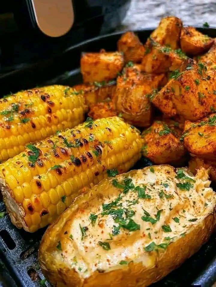The air fryer has become a modern kitchen hero. It promises crispiness without excess oil, speed without sacrificing flavor, and versatility that makes it indispensable. A complete dinner plate—juicy chicken, golden potatoes, and sweet corn—can be made in one appliance, saving time and effort while still delivering comfort and satisfaction.