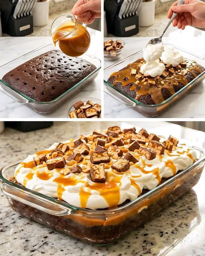 Spread whipped cream over cake. Sprinkle chopped Snickers bars. Drizzle caramel. 👉 Visual cue: Cake should look decadent, layered, and inviting.