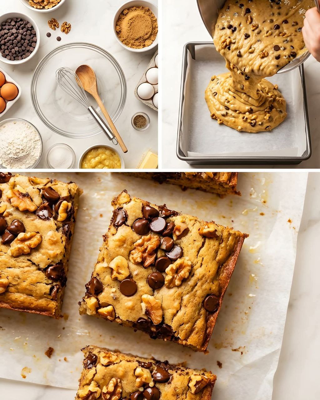 Cooking blondies is about rhythm: mash, whisk, fold, bake, cool. The kitchen fills with aromas—caramelized sugar, ripe bananas, butter. When you slice them, you see harmony: golden squares, chewy edges, soft centers. It’s indulgent yet balanced, rustic yet refined.