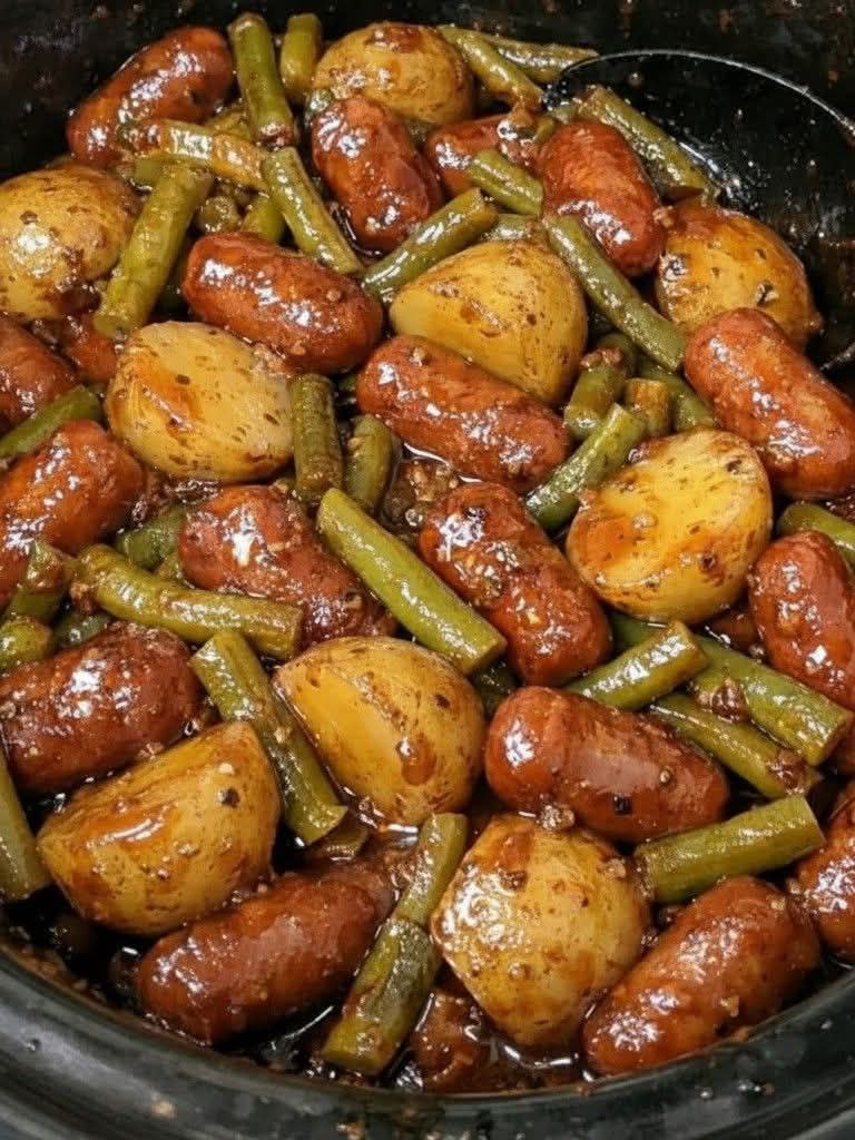 Sausage-and-potato dishes appear worldwide: German bratwurst with potatoes, French cassoulet, American Southern-style sausage stews. Green beans add freshness, echoing farm-to-table traditions. The slow cooker reflects modern convenience, blending old-world flavors with contemporary technique.
