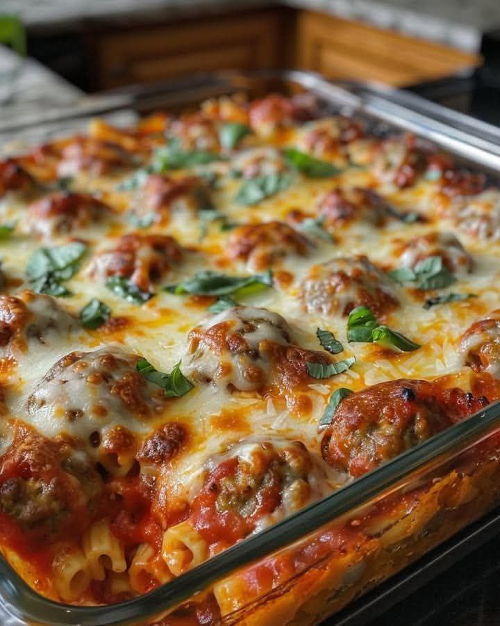 Cover dish with foil. Bake at 375°F (190°C) for 35–40 minutes until pasta tender and meatballs heated through. 👉 Why: Covered baking traps steam, cooking pasta evenly.