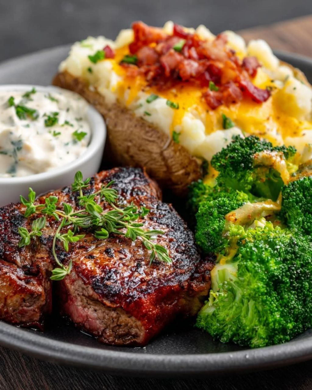 Juicy Steak with Loaded Potato, Broccoli & Creamy Dipping Sauce is more than a recipe—it’s a celebration of comfort and elegance. Juicy steak, decadent potato, fresh broccoli, creamy sauce. Every bite delivers contrast: savory, creamy, crunchy, fresh. It’s timeless, versatile, and deeply satisfying.