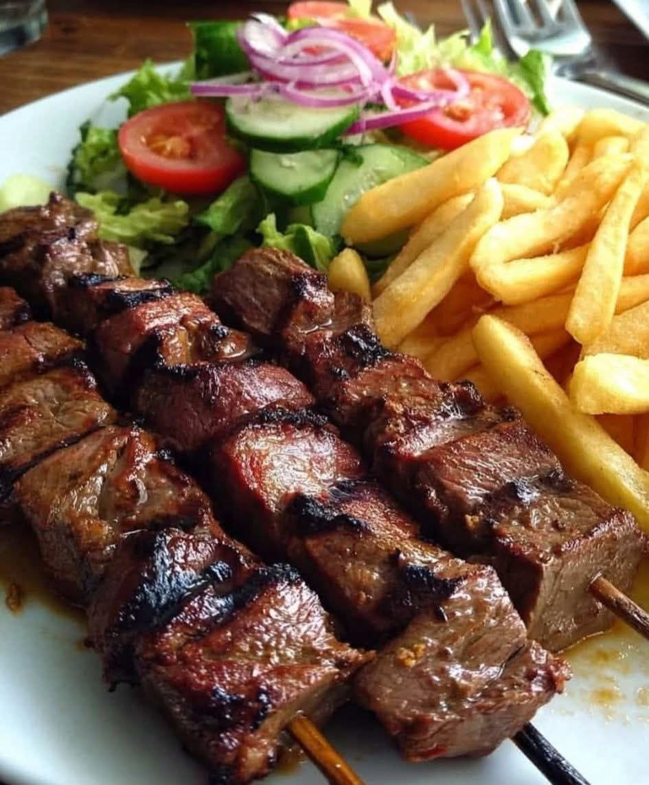 The first time I made beef skewers, I rushed the marinade and skipped resting the meat. The result was chewy and bland. The second time, I marinated the beef overnight with garlic, herbs, and spices, grilled it patiently, and paired it with fries and salad. The result was transformative: beef tender and juicy, fries crisp and golden, salad bright and refreshing. That’s the rhythm this recipe demands: patience, layering, and respect for each element.