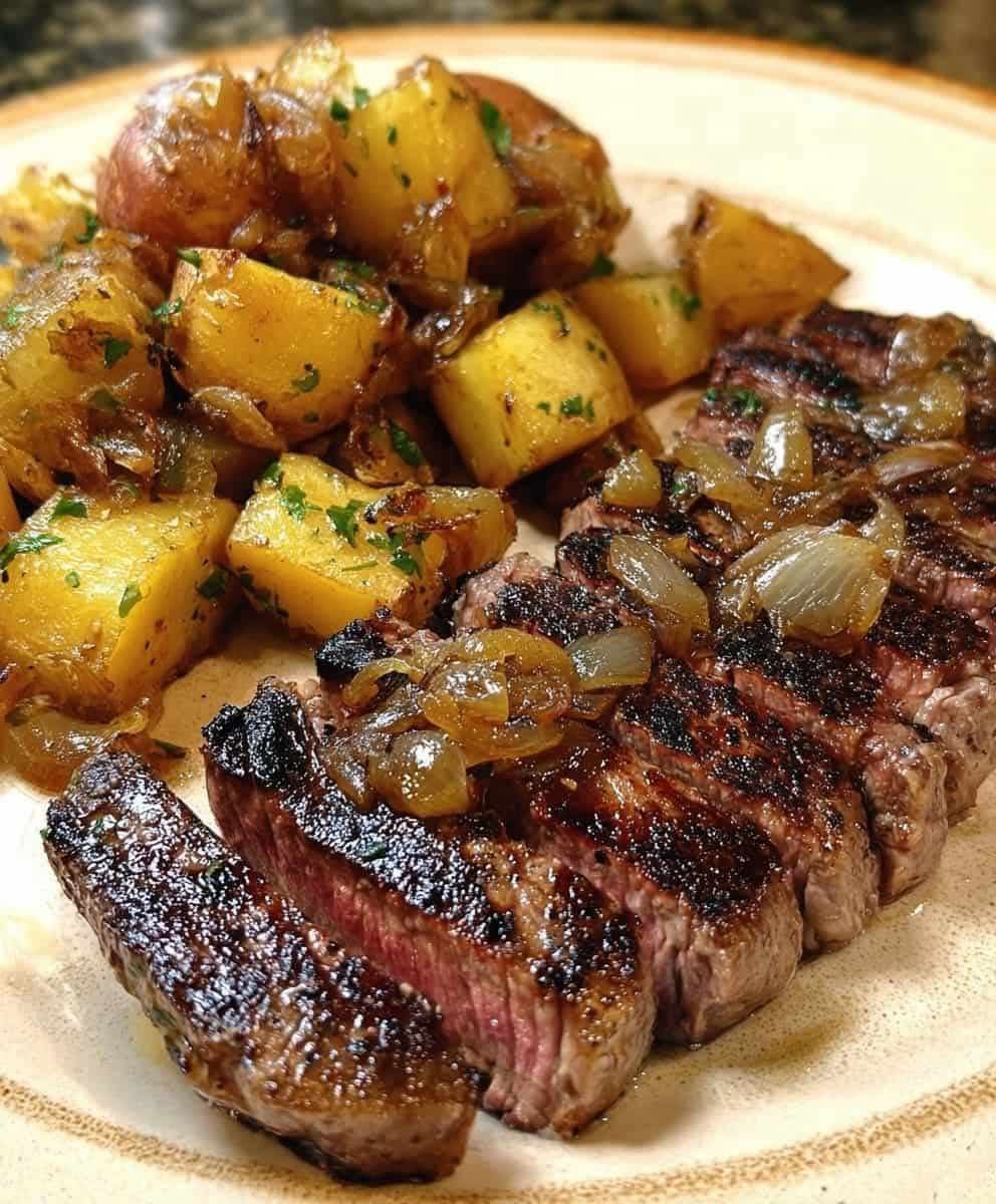 Grilled Steak with Caramelized Onions & Roasted Potatoes is more than a recipe—it’s a celebration of comfort and elegance. Juicy steak, sweet onions, crisp potatoes. Every bite delivers contrast: savory, tender, fragrant, crunchy. It’s timeless, versatile, and deeply satisfying.