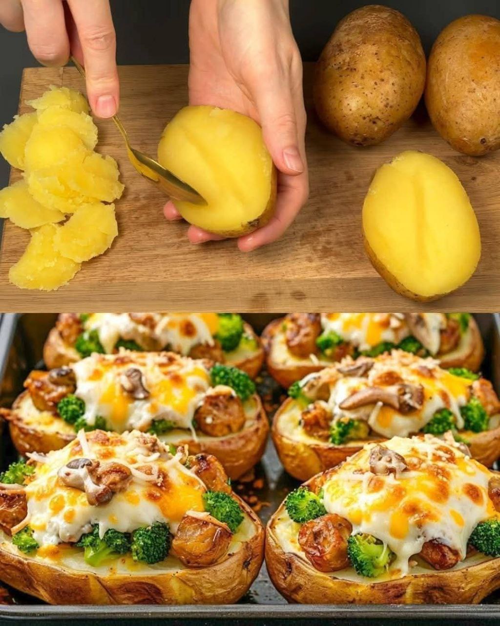 This dish is about rhythm: bake, scoop, sauté, mash, stuff, bake again. The potatoes become vessels of comfort, their fluffy interiors transformed into a creamy filling enriched with chicken and broccoli. Cheese binds everything together, melting into golden ribbons that stretch with each bite.