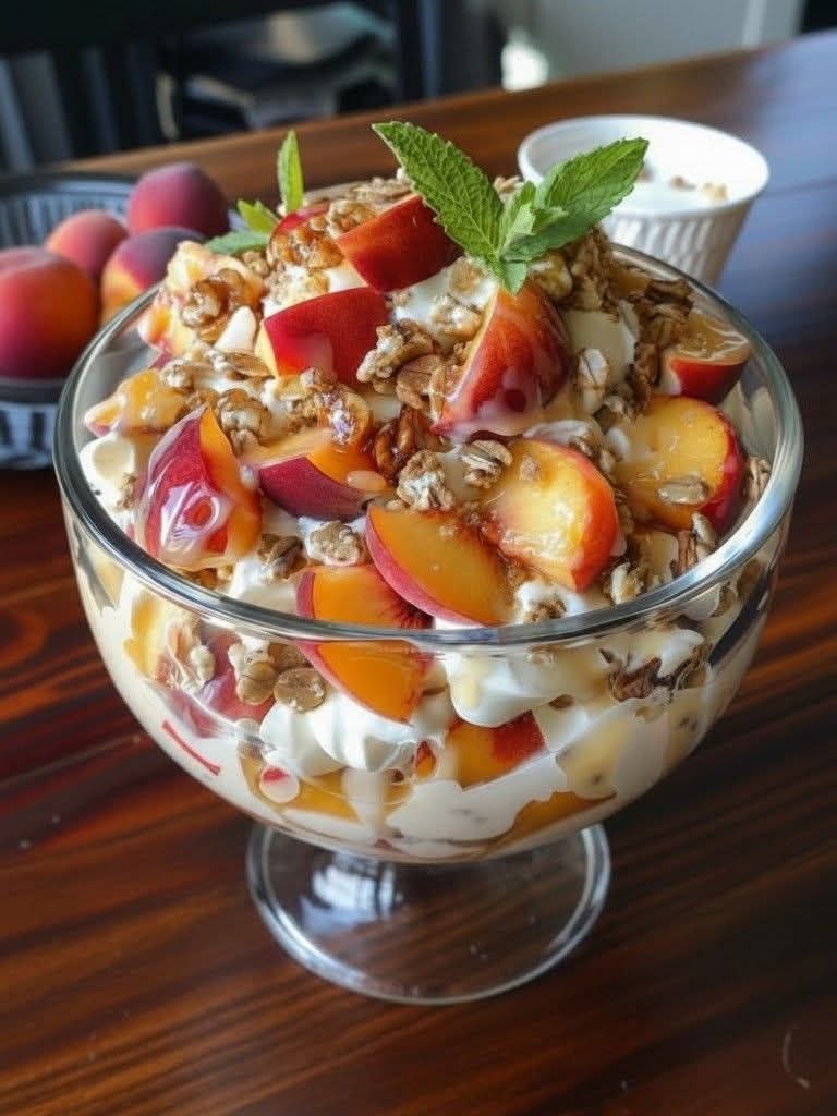 There’s something magical about a breakfast that looks as good as it tastes. A bowl filled with golden peaches, velvety yogurt, and crunchy granola isn’t just food—it’s a moment of calm, a burst of sunshine, and a nourishing start to your day.