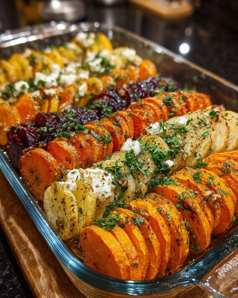 Layered Sweet Potato Butternut Squash & Carrot Bake with Feta Pecans & Cranberry Honey Glaze